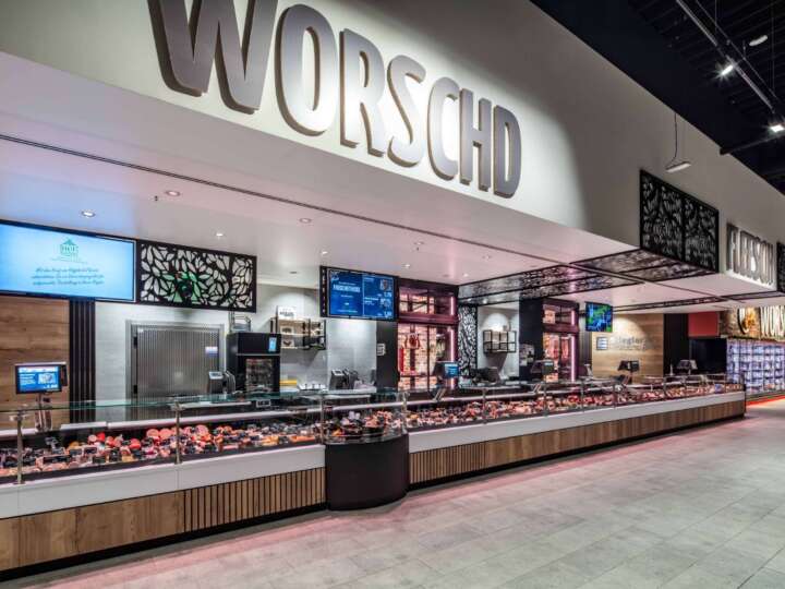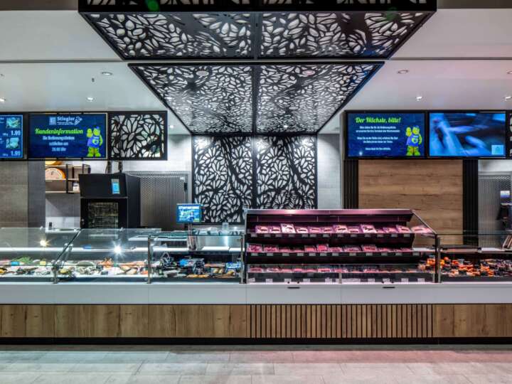 Um neue Kundinnen und Kunden gezielt an die Bedientheke zu führen, entwickelte das AICHINGER Shop-Design ein durchgängiges Gestaltungskonzept. An der Bedientheke werden die Premiumprodukte, Spezialitäten von regionalen Erzeugern und die eigenen Prepacked-Wurst- und Fleischwaren in einem SB-Kühlregal in der Thekenlinie präsentiert.