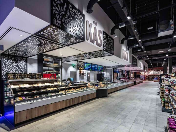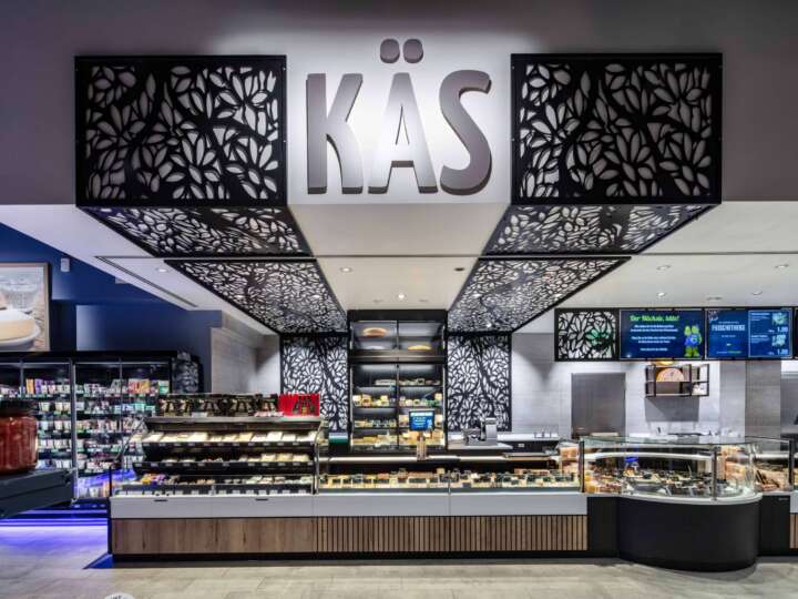 Ein Band aus Metallplatten mit einem ausgestanzten floralen Muster zieht sich vom Deckenkoffer der Thekenanlage bis zur Rückwand. Die Displays werden von den Elementen eingefasst. Die Thekenfront wird durch einen Wechsel der Dekore aus Eiche natur und Eiche mit aufgesetzten Leisten aufgelockert. Zusätzliche Struktur schaffen die unterschiedlichen Thekenelemente. Neben den Dekorelementen und den großen Lettern KÄS, FISCH, FLEESCH und WORSCHD strukturieren verschiedene Thekenelemente die imposanten 30 m Thekenanlage.